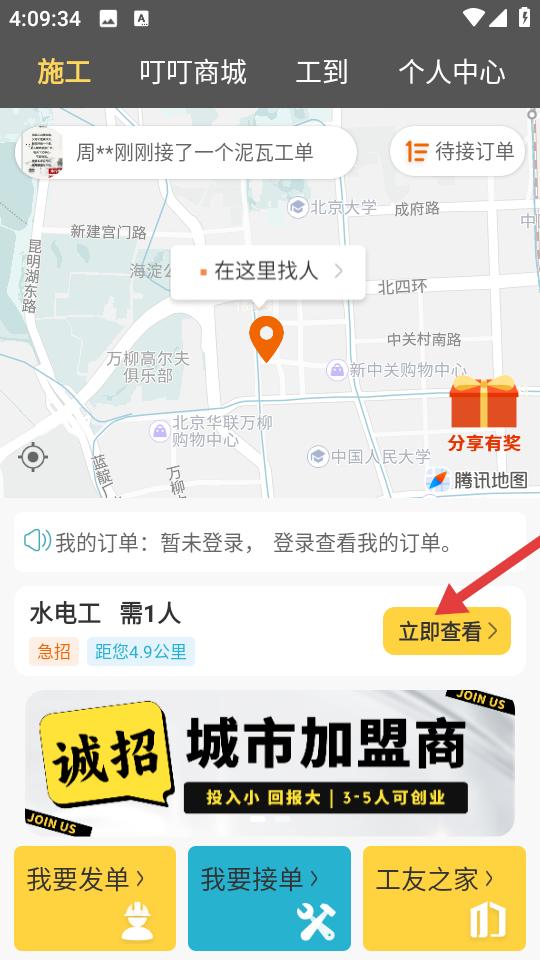 1、进入施工界面地图定位精准标记位置,待接订单动态更新,附近工单如水电工需求清晰展示,距离标注直观,立即查看按钮便捷。