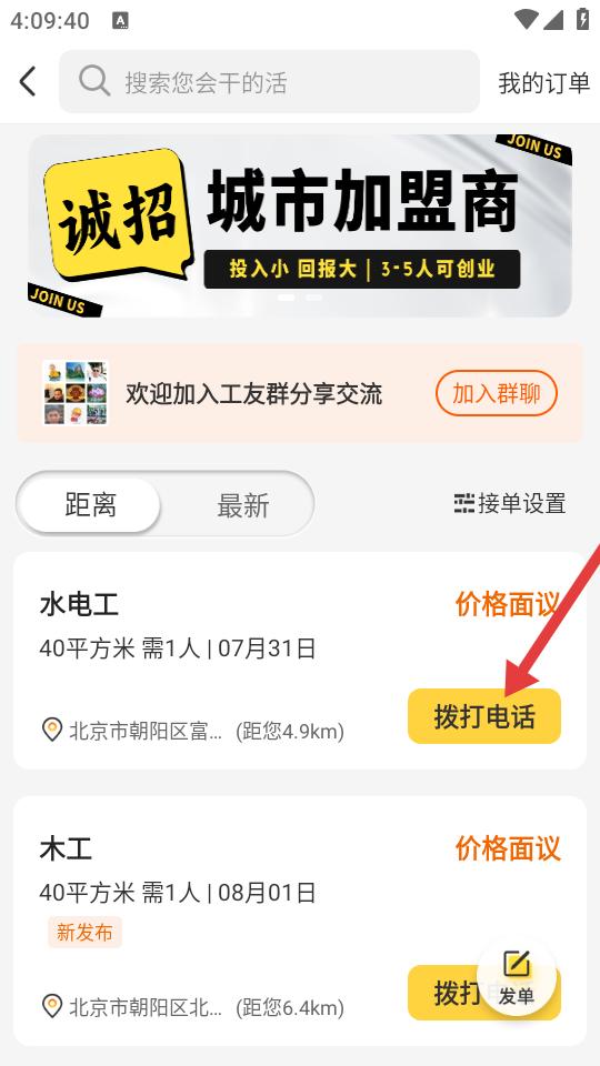 2、打开接单页面搜索栏支持查找擅长工种,订单列表分类呈现,水电工木工等需求明确,距离最新筛选灵活,拨打按钮方便联系雇主。