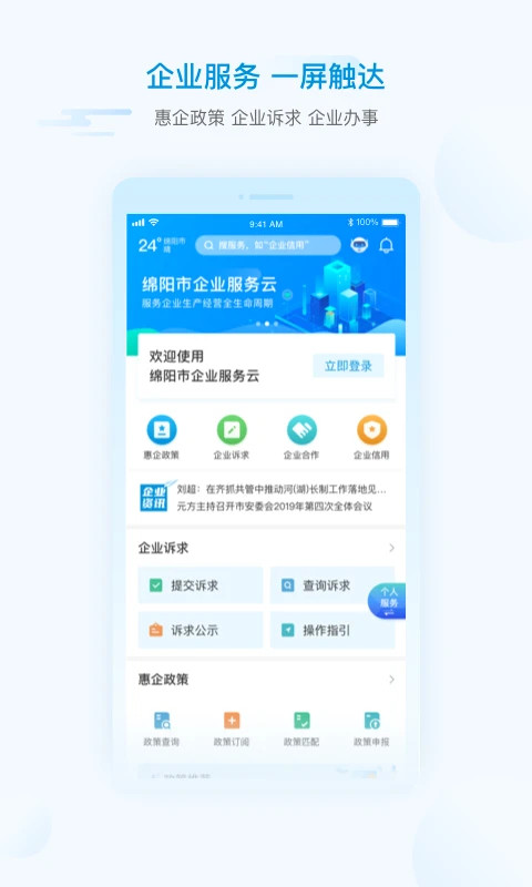 【营商服务】绵阳市企业服务云提供企业诉求提交、惠企政策精准查询、企业帮办代办、企业合作平台、中小企业扶持、融资、税务、法律等企业全生命周期办事服务,让企业享受“指尖办事”的便利。