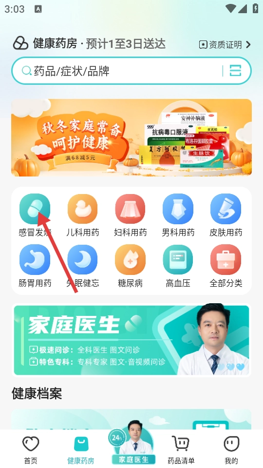 2、在健康药房页面,点击“感冒发烧”分类,进入感冒药品列表页面。