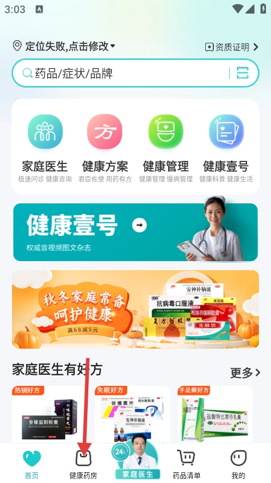 1、在主界面,点击“健康药房”选项,进入健康药房页面。