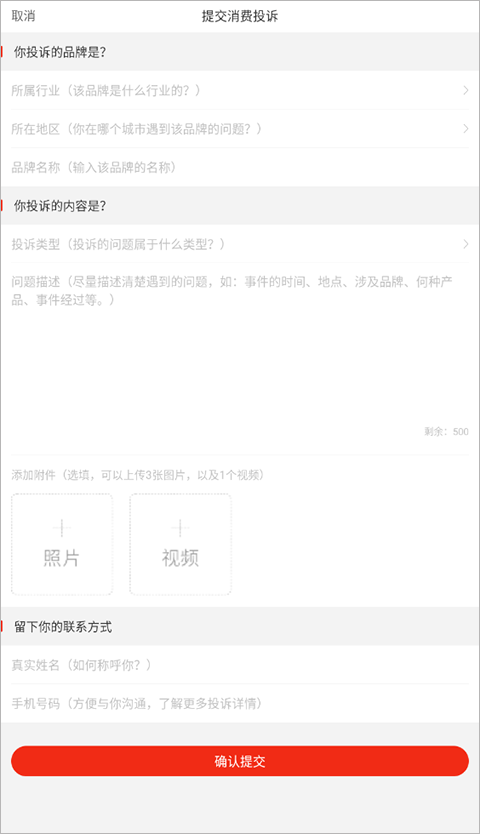 3、将投诉品牌、地区、名称、内容、以及联系方式等信息填写好后,点击确认提交即可。