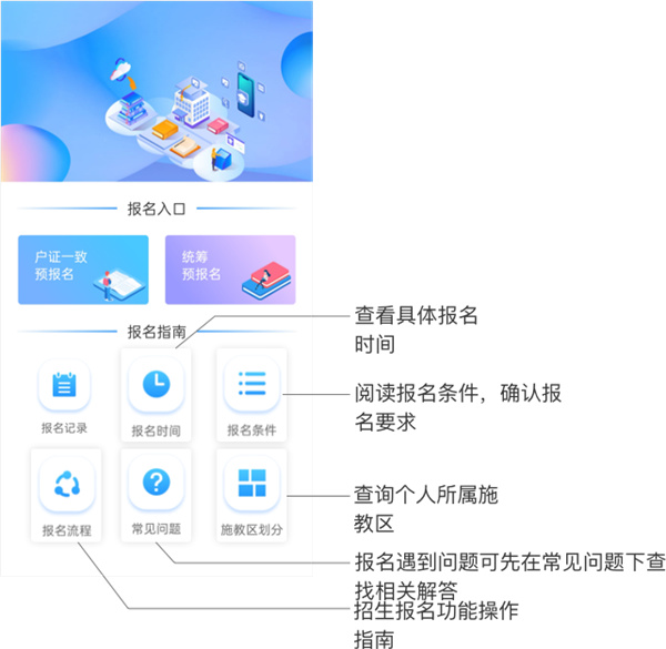 功能分为【报名入口】和【报名指南】两个模块,在正式报名前,请先阅读【报名指南】模块下的相关文件。