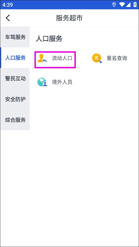2、在服务超市界面的人口服务一栏中找到并点击“流动人口”功能选项;