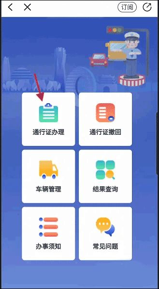 4、在进入智安通(货车通行证)界面后,找到并点击“通行证办理”功能选项;