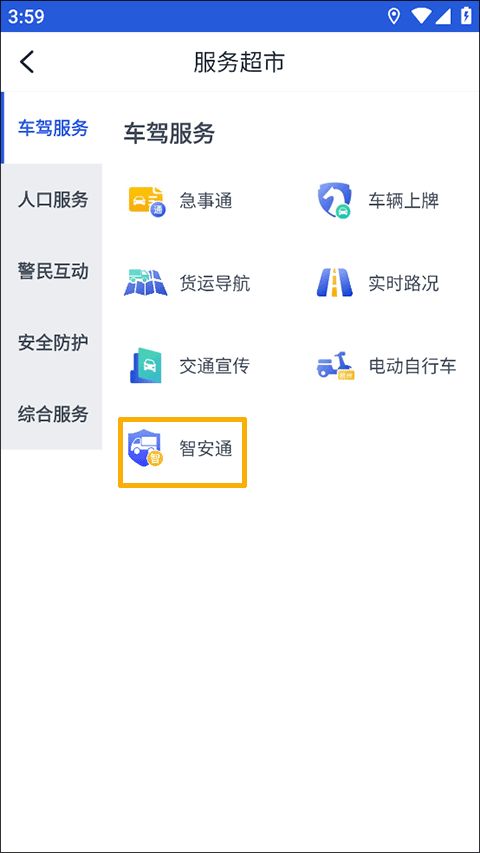 2、在服务超市界面的车驾服务一栏找到并点击“智安通”功能选项;