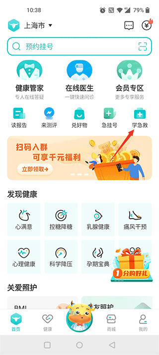 1、打开并登录蛮牛健康App进去可以看到有许多的软件功能按钮,我们选择如图所示的学急救。