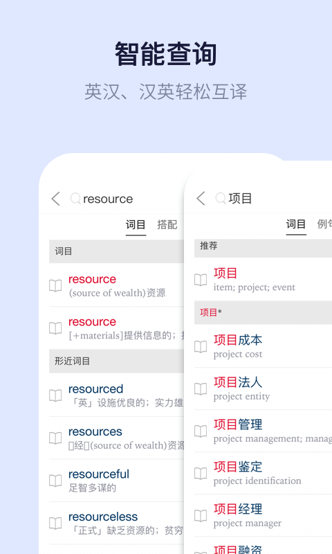 1.查词方便快捷:英汉、汉英双向查询,短语、搭配、例句等相关内容都能智能检索。