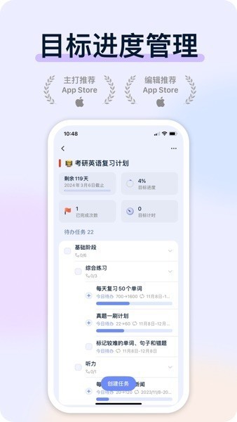 b、跨天任务:需要一段时间去完成的事项。例:在“毕业论文”这个目标下可以创建“调研10篇学术论文”的任务