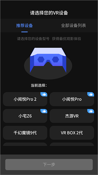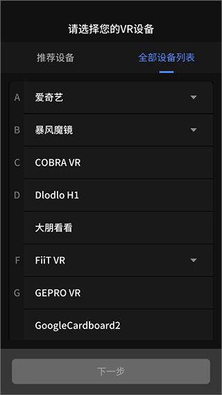 然后打开爱奇艺VR app选择一款设备后点击【下一步】