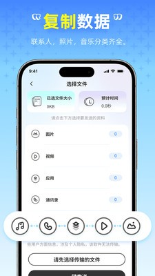 1.支持通讯录、短信、通话记录、照片、视频、音频等数据的迁移。