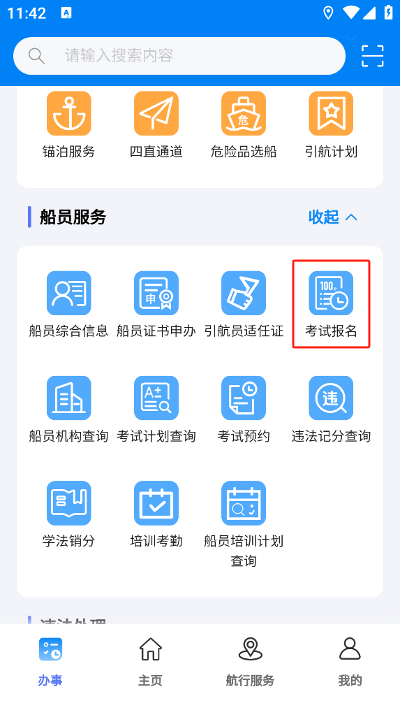 考生在办事页面点击“考试报名”,根据需要选择“适任证考试”报名或“合格证考试”报名。
