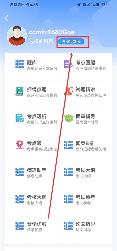 2、点击【选择科室】来选择你要练习的科目;