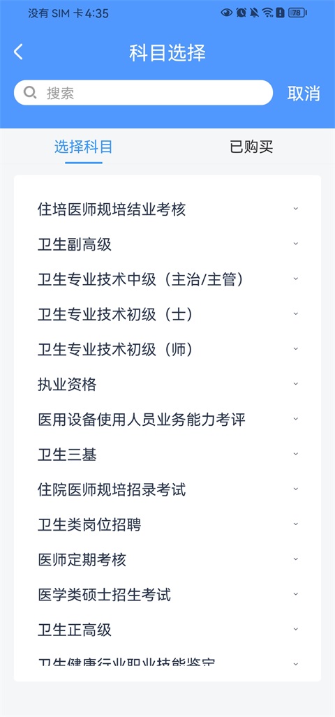 3、在科目选择页面,选择你需要备考的考试科目;