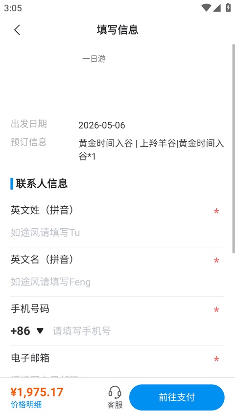 4、点击【预订】,填写游客信息后确认订单并完成支付,即可预订成功!