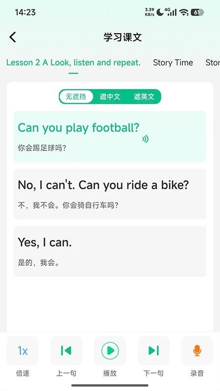 1、用户可自由选择想要练习的单词或句子,随时播放标准语音示范进行跟读
