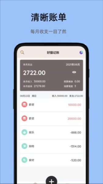好猫记账app是一款专为记录用户的花销账单而设计的软件,这款软件可以记录你每天不同种类的所有花销,并生成花销占比总结。这款软件还支持同时多笔不同记账,随时可以生成账本。软件支持离线记录保存,让你随时随地都能查看消费记录。