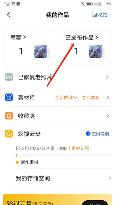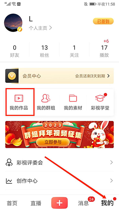 1、打开彩视app,选择右下方“我的”选项,进入到个人中心界面,选择“我的作品”图标;