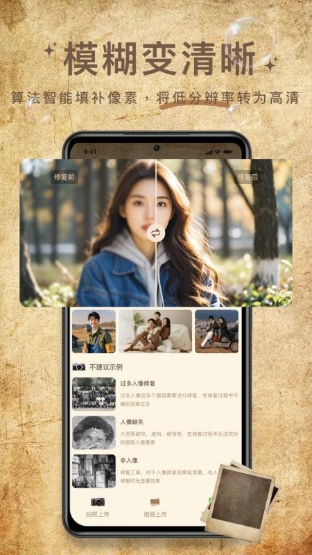照片修复大神app是一款可以将模糊的照片变清晰的软件。用户将照片上传后,软件通过智能识别之后通过色彩的填充,让照片看着变清晰了。软件里面也有很多好玩的功能,比如改变照片上的人物性别、一键变换表情、去除其他人等等。照片也可以进行多张拼接,让你的照片更精彩。