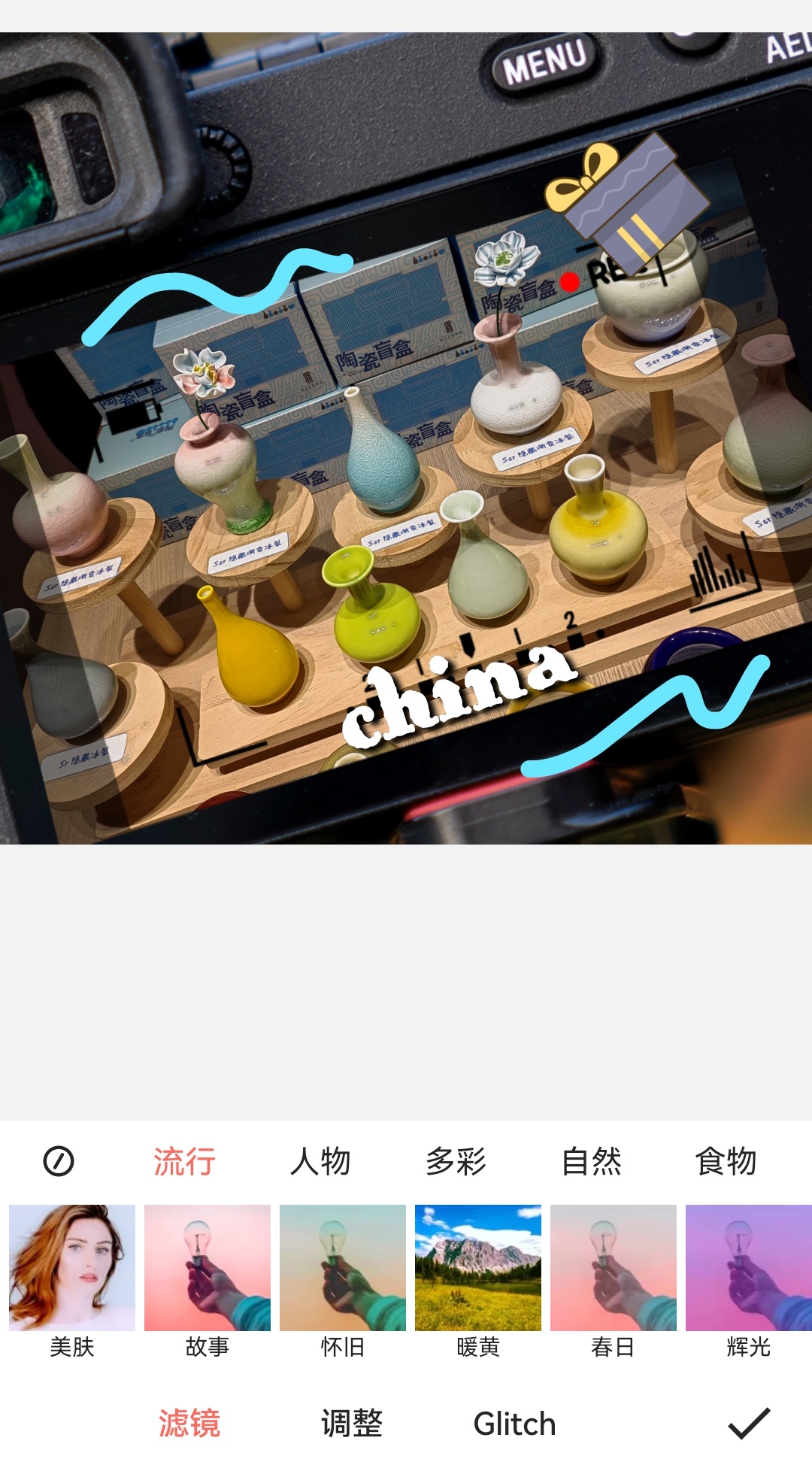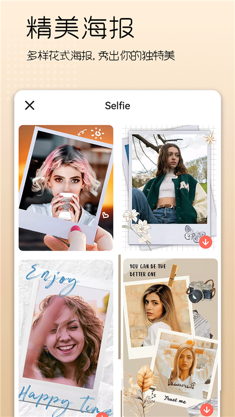 3、创意内容添加:提供文字模板、潮流贴纸、个性涂鸦笔,结合200+滤镜,丰富照片表现力。
