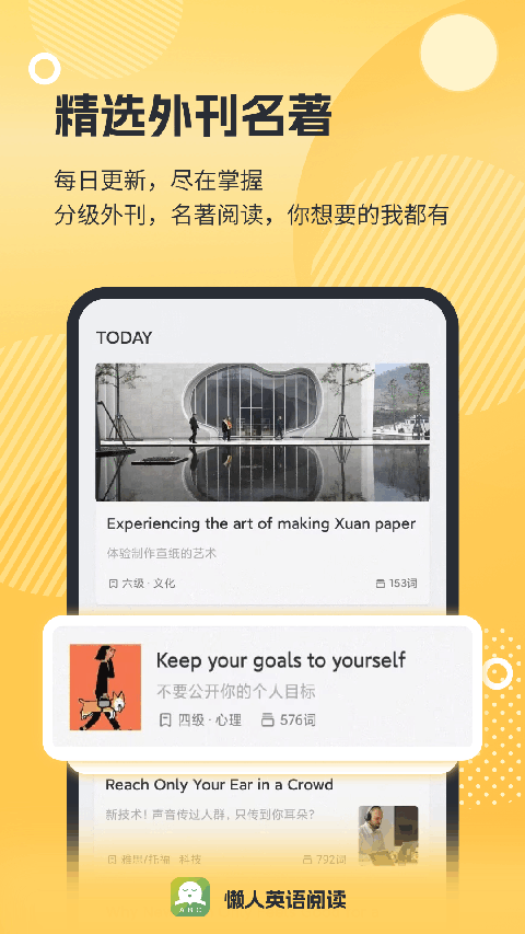2、每天都会推荐实时的英文资讯,聚合各大网站的英文资料,支持分级阅读,按照高中英语,英语四级,英语六级,考研,雅思,托福等难度等级分类,适合各英语爱好和学习者;