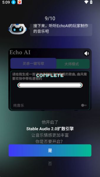 1、打开登录EchoAI一键成曲app后进行简单的ai问答流程后即可启动它进行ai音乐创作,创作时只需要用户输入简单的文字描述即可创作