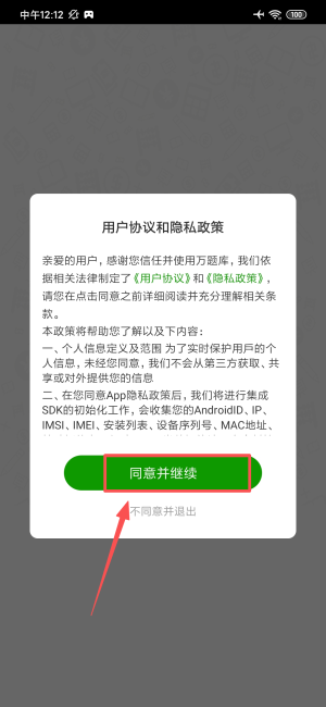 1、打开应用后在用户协议提示框内点击红色同意并继续按钮,进入程序。