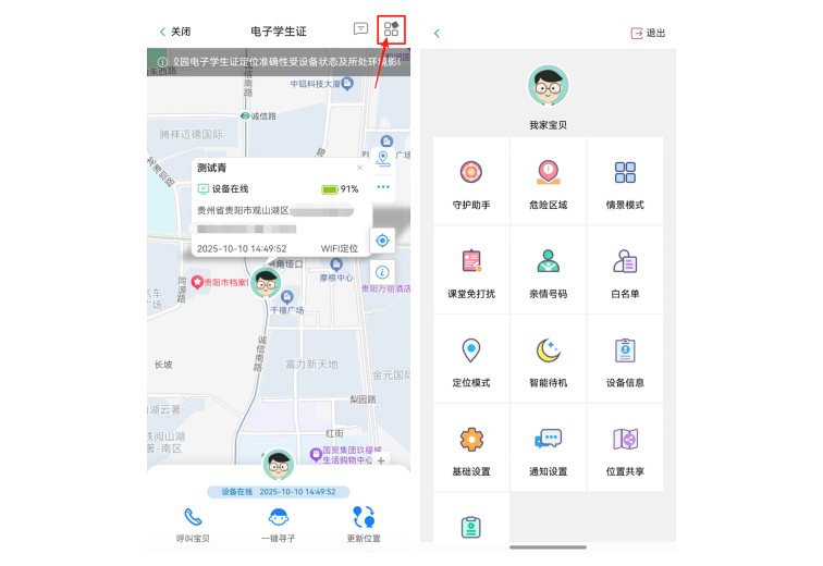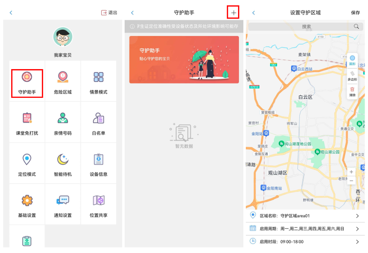设置 “安全圈”,进出自动预警守护助手是电子学生证的核心安全功能模块,通过点击"守护助手"界面的"+"标识,可启动安全区域绘制功能,支持圆形及多边形围栏形态设置,实现精准活动范围界定。选区域形状:圆形(适合家、兴趣班,建议设 500米范围)、多边形(适合学校校区,精准框选教学楼 /操场);填区域名称(如 “贵阳市 XX小学”“家”),设生效周期(学校选 “周一至周五”)和时段(如 “7:30-16:30”)→保存;