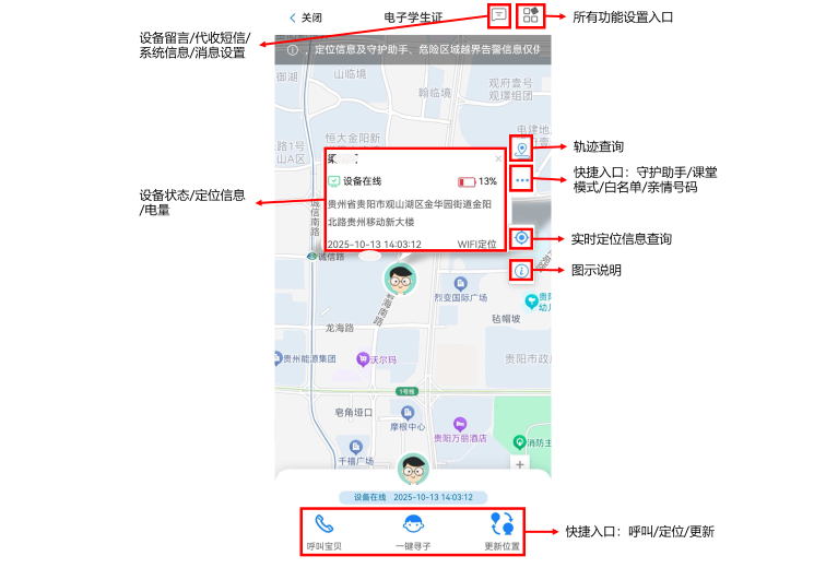 底部栏:“呼叫宝贝”(一键给孩子打电话)、“一键寻子”(定位孩子当前位置)、“更新位置”(刷新查看最新定位),应急操作更高效。