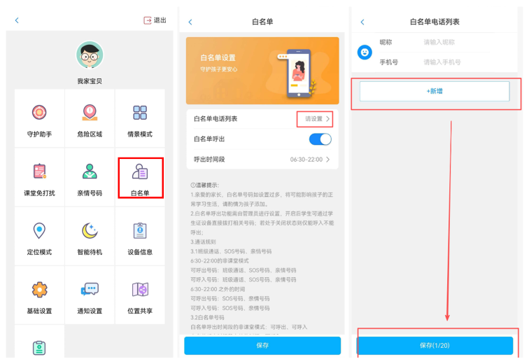 点击 “添加号码”,最多设置 10个(建议添加家人、朋友、班主任的号码);白名单启用时间段(可设置上课时间和夜间休息时间限制呼入)。