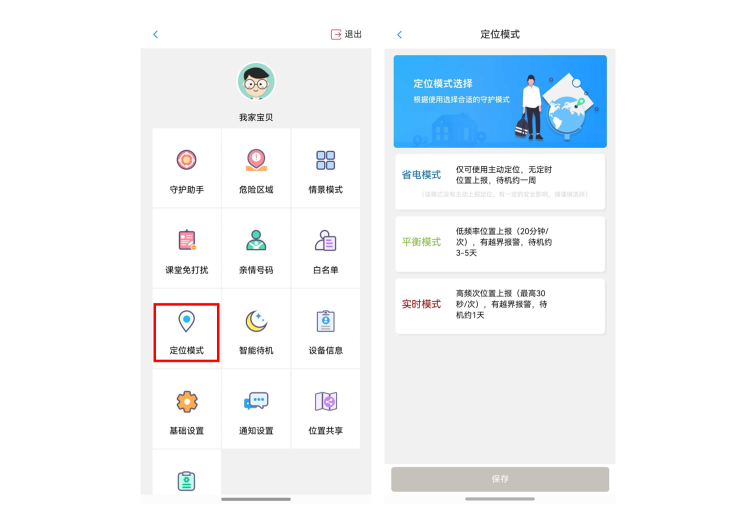 3种模式按需选,安全又省电定位功能支持家长按需使用。通过点击"定位模式"选项,自主选择不同定位策略,实现定位频次与设备续航的精准调控。