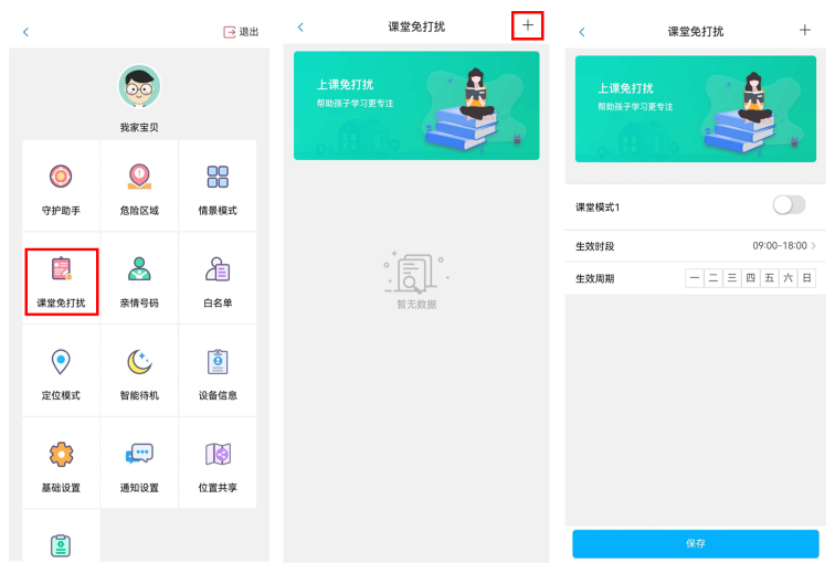 2)【课堂免打扰】:"课堂免打扰"功能可以设置课堂模式,在设定时间段内自动禁用通讯功能(包括SOS号码+亲情号码),确保在上课期间学生证设备处于不影响教学的状态。【课堂模式】:课堂时段管理支持动态配置,点击右上角“+”可新增课堂时段,最多可新增5个课堂时段。时段生效需完成"新增-保存"双步骤操作,左滑即可删除。