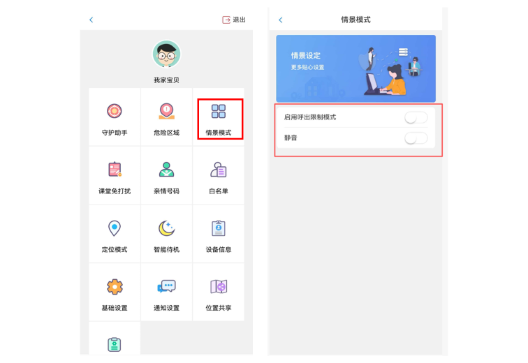1) 【情景模式】:情景模式功能支持场景化通信管控配置,家长通过点击"情景模式"选项可激活呼出限制模式与静音模式双通道管理。