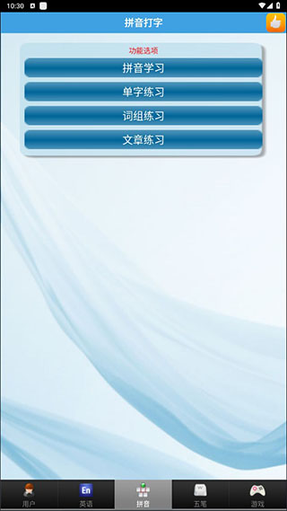 3、点击屏幕下方的拼音按键,即可进入拼音打字的练习界面,可以进行拼音、单字、词组、文章练习。