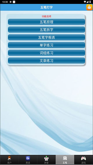 4、点击屏幕下方的五笔按键,即可进入五笔打字的练习界面,可以进行拼音、单字、词组、文章练习,也可以了解五笔原理,五笔拆字,五笔字根表。
