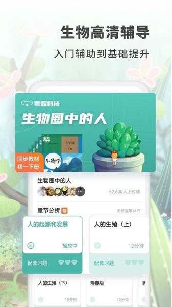 针对初中生物重难点知识点,提供高清讲解视频,不限次数观看!云端储存学习记录,多倍速播放,适应各种层次学。