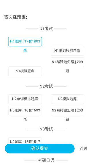 3、题库类型有很多,比如N1考试、N2考试、N3考试、考研日语等等,选择完成后点击提交