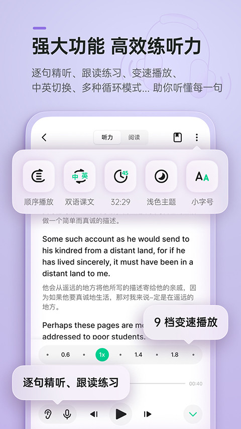 音视频课程均配有中英同步课文,还可切换为单语/无课文模式练习听写和翻译