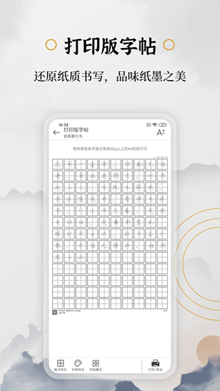 3、可生成打印版字帖,真正的用纸笔来练字。支持A4尺寸纸张。导出字帖后可用手机连接打印机或将字帖发送到电脑用打印机打印。