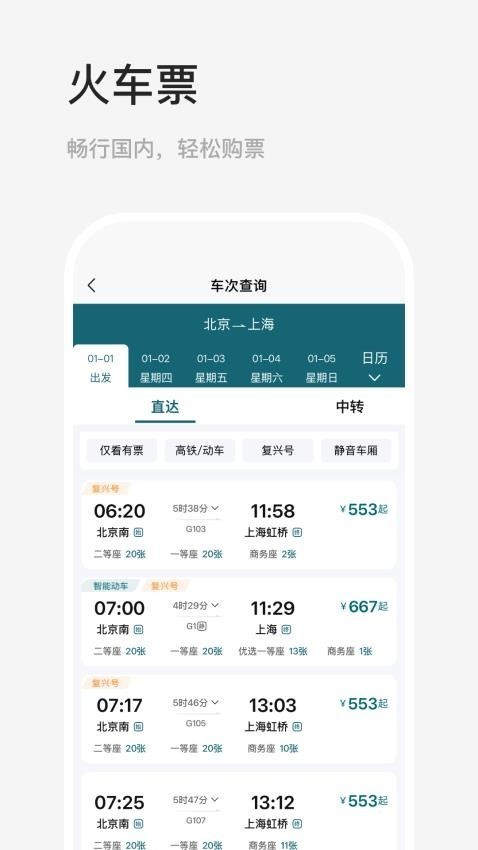 2、还可以查询火车票的车次信息,可选择车次下单购票;