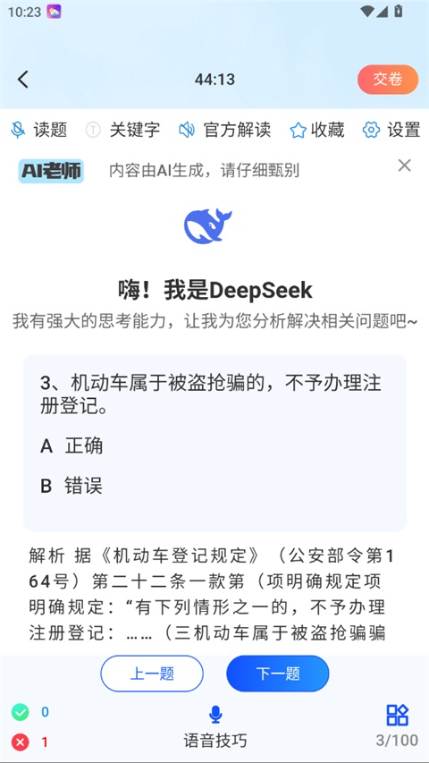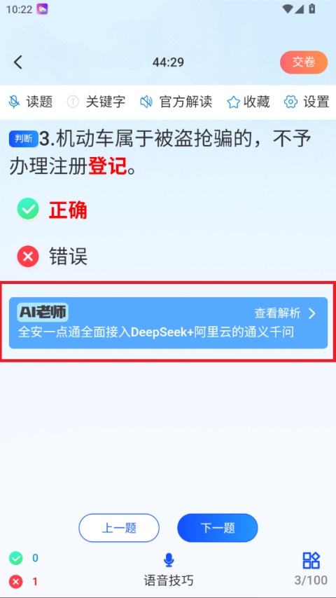 4、进入答题页,可使用读题、关键字、官方解读等辅助功能,选择正确答案;
