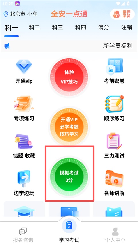 1、打开全安一点通App,在"学习考试"页的科一板块,点击"模拟考试";