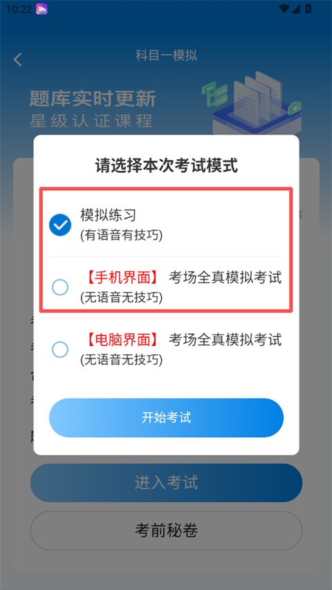 3、在弹出的考试模式选择中,可选择"模拟练习(有语音有技巧)"或"考场全真模拟考试(无语音无技巧)",点击"开始考试"。