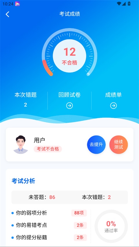 6、系统自动生成考试成绩,展示本次错题、未答题、弱项分析等内容,后可查看错题,针对性强化薄弱知识点。
