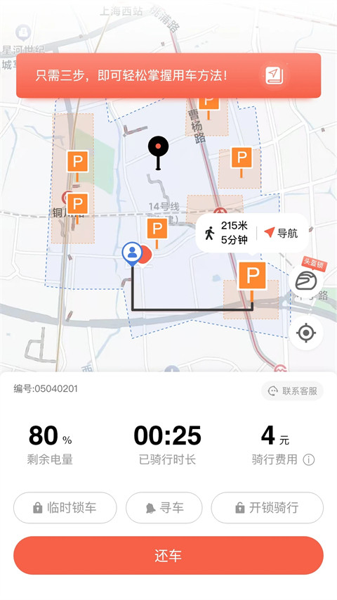 2、根据地图上的显示找到最近的共享电单车的位置,扫码解锁。同时也支持编码解锁。