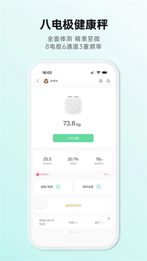 1、好体知体脂秤app下载安装手机版对人体组成进行细致的分析,实时掌握健康状况。