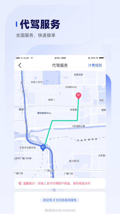 代驾服务:全国范围快速接单,线上支付省时省力。