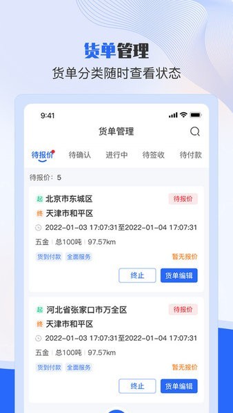 1、美达托运人所有的货单管理服务由待确定订单,进行中订单,待接单订单,代签收订单,以及已完成订单等等详细划分;