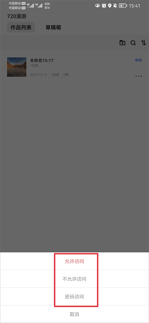 1、作品制作完成后可以在作品列表中查看制作完成的全景图,用户通过点击作品右边的三点,可以为作品设置访问权限