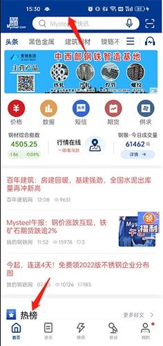 1、打开我的钢铁app,点击底端的“首页”选项,然后点击搜索框。